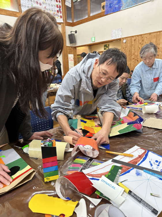 そしてこの日も、はじめましての人と机を囲み、お隣同志でおしゃべりしながら、手伝ったり手伝ってもらったりしながら、それぞれの創作を楽しみました。自分の作品だけど、どこかに人の感性も入って、思いがけずいつも以上の仕上がりに。アートの交流があちらこちらで形になった素敵な時間でした。
