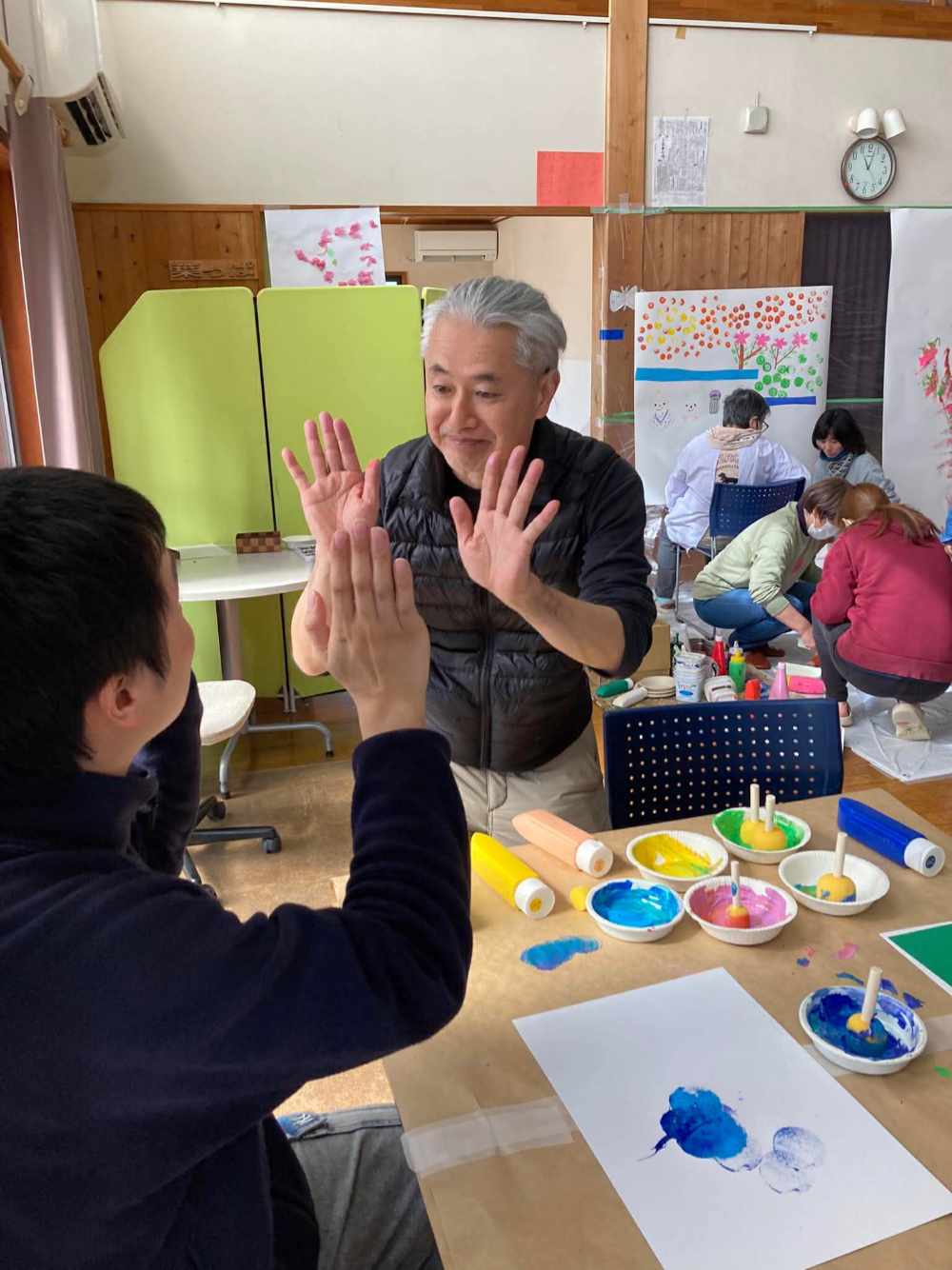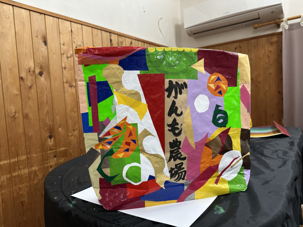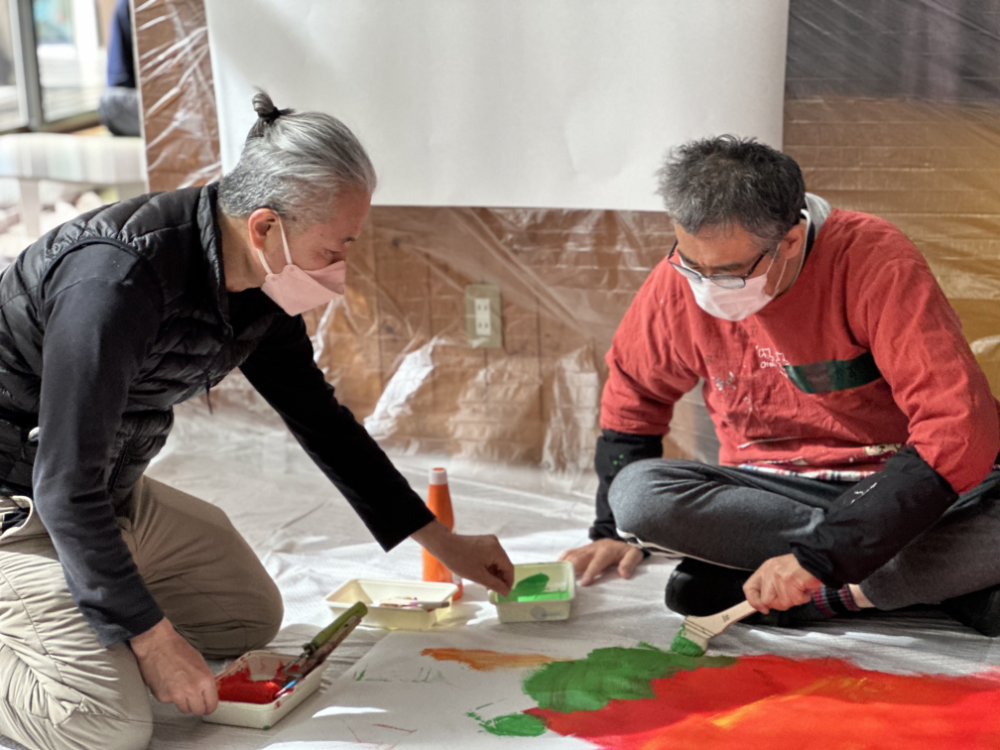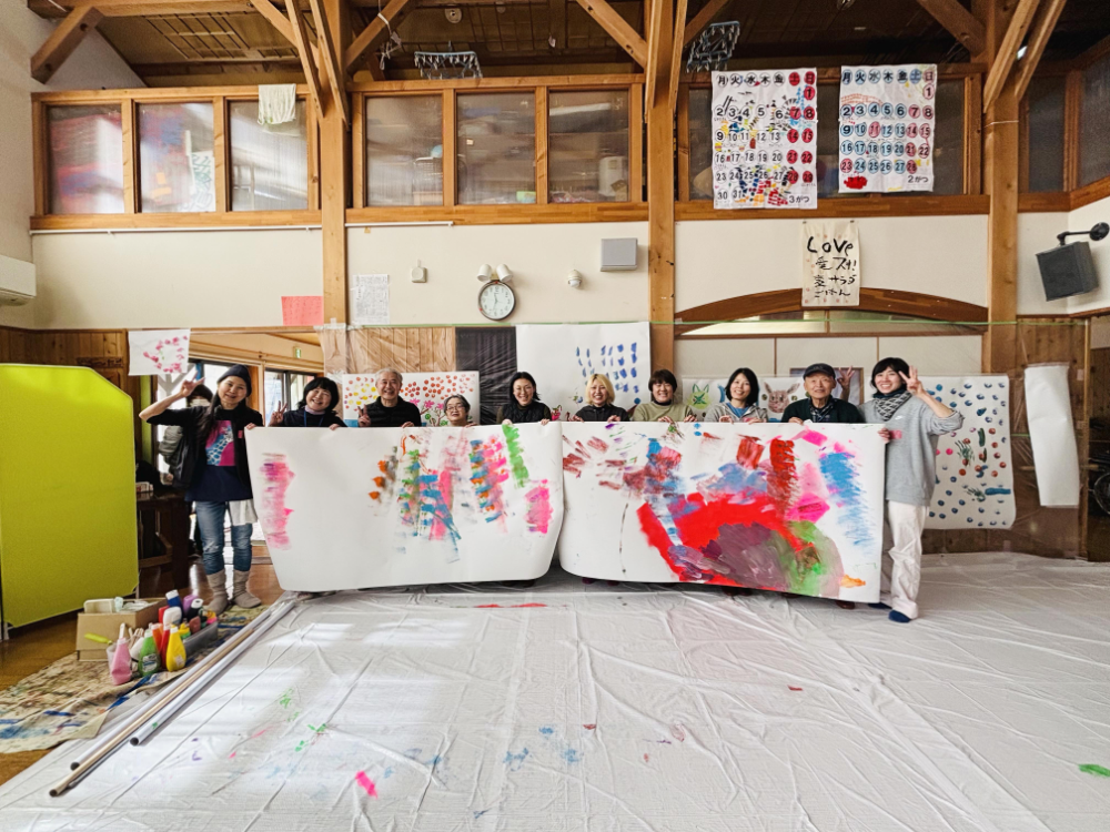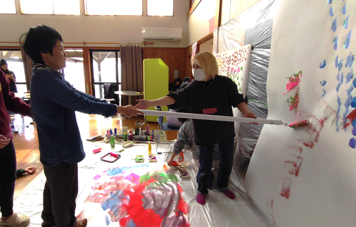 午後は、この街のグループホームや地域から、障がいのある参加者さんが集まってきて、みんなで大きな絵を描いたり、花やちょうの形に切り取った画用紙に色づけをしました。小川さん手づくりのさまざまな道具にみなさん興味深々で、絵筆とは違う描き味を楽しんでいました。あっという間に大きなロール画用紙に4枚の共同制作。いい汗かいたな~。