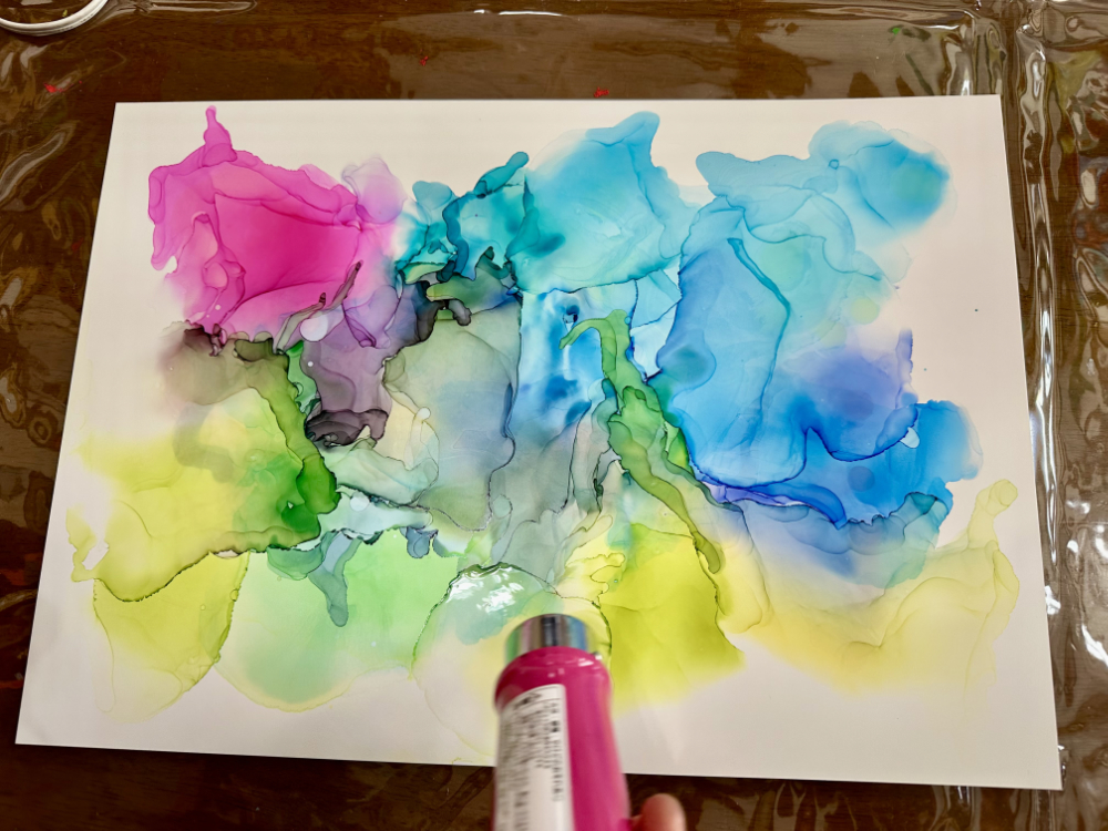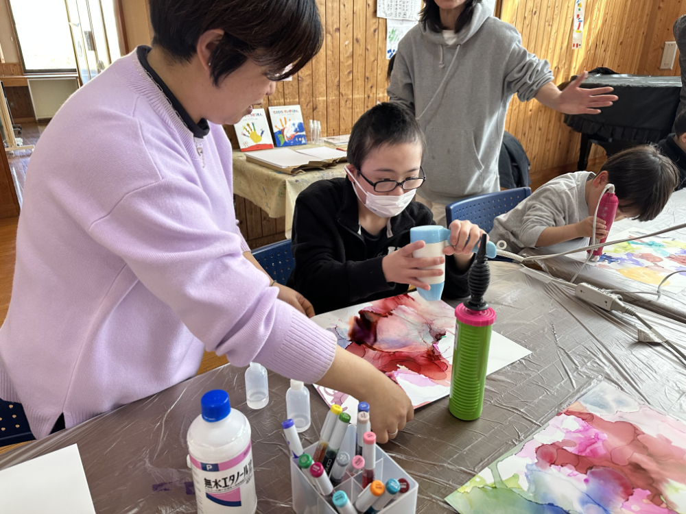 アルコールインクアートでは、アトリエももものスタッフ・ゆかさんがファシリテート。初めての画材に、最初は戸惑いながらもハマる人多数!