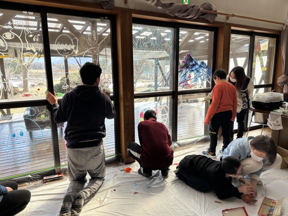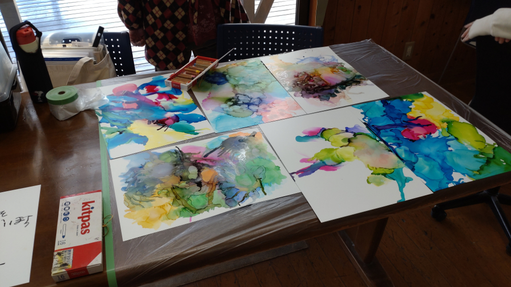 当日はみんなで「アルコールインクアート」と「キットパスでらくがき」をしました。