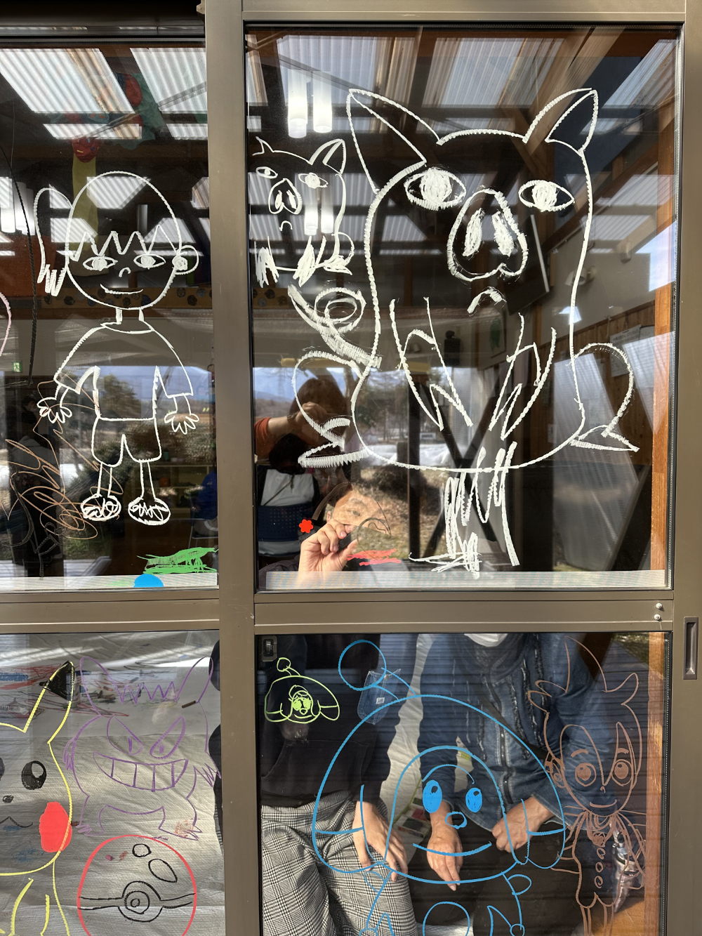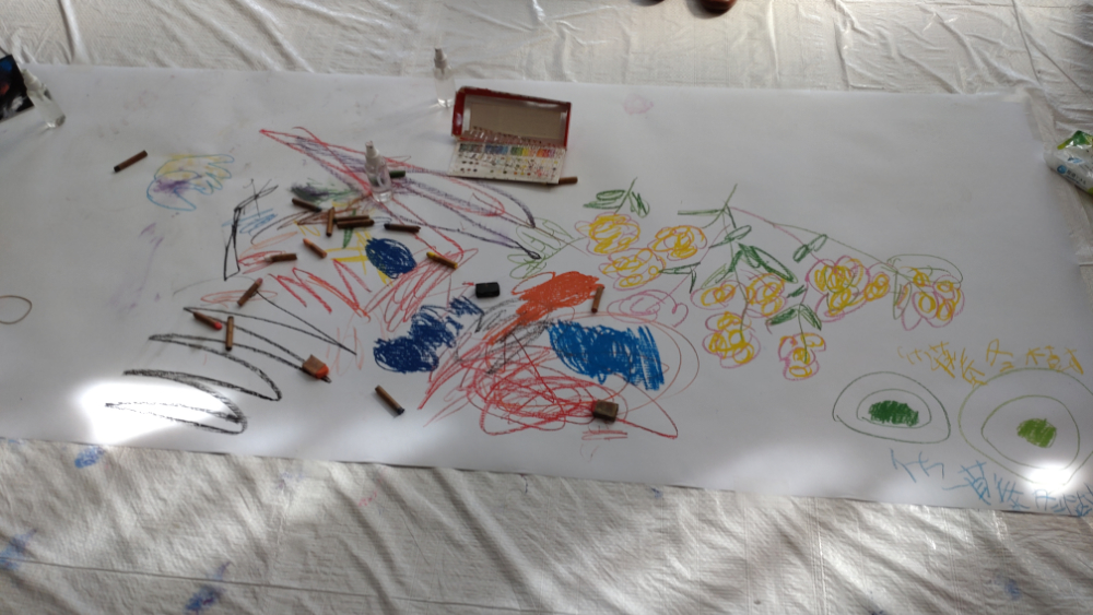 キットパスのらくがきは、大きな窓とロール画用紙で。アルコールインクアートで開いた感性が大爆発(笑)ゴロゴロ寝転んだり、跳ねたり歌ったりしながら、楽しくらくがきしました。サポートにキットパスインストラクターの方が来てみんなの虹色🌈手形を取ってくださり、お母さんたちもキットパスに興味津々。